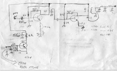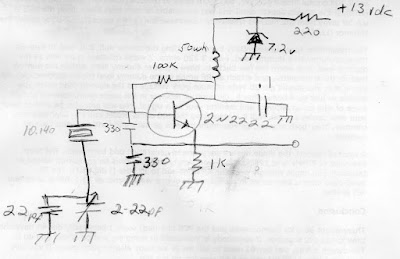 Guys have been asking to see the schematic for my 30 meter QRSS MEPT beacon. Here’s the oscillator circuit. This actually started out on a plane ride. My son Billy and I were talking about electronics. I drew a basic schematic for an oscillator, and we built one when we got home. It originally used a 20 meter crystal. At one point we were playing “find the oscillator” — hiding it somewhere in the house, and tracking it down with a Sony shortwave receiver. Now, with some modifications, it is the first stage in my 30 meter MEPT beacon.