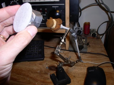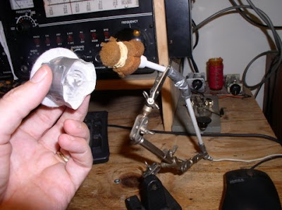 As promised, here is the infamous SolderSmoke microphone, featuring duct tape, and supported by a Radio Shack “Third Hand.”