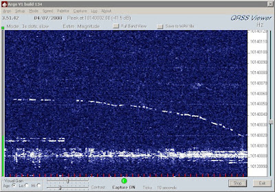I wanted to give you guys a sense of what you can see on the QRSS Grabbers. The grabbers are just the output screens from the Argo or Spectran (or other) software that have been placed on-line, updating every few minutes. In the screen shot above, you can see the sophisticated signal of Eddie, G3JZO, pounding into Belgium (this is the Grabber of Johan, ON5EX). My much more basic effort is visible as a line of Morse Code just below Eddie’s sig. Above Eddie you can see the “snake CW” of IQ4FJ. Along the bottom right of the screen, you will see the square wave signal from the 5 mw solar powered beacon of Paolo, IZ1KXQ (scroll down a bit to see his rig, and his schematic). I think the vertical stipes must be lightning.