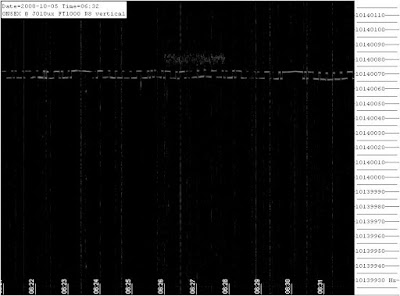 The online grabber of Johan, ON5EX, provided instant gratification this morning. Right after I finished some modifications that I hoped would result in a Frequency Shift Keying signal on the 30 meter visual QRSS band, looked at the grabbers and found this. That’s me. It is a kind of “upside down” FSK. Look along the bottom of the square wave and you can read the CW.