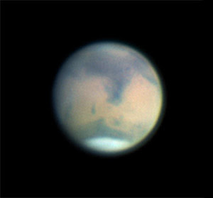 I didn’t take the picture, but the shot above gives you a good idea of what I was looking at on Saturday night. The Northern polar cap was very apparent in my six inch Newtonian Dobsonian. It looked like it had a dark border around it. Martian North is at the bottom in this shot. It is Spring in the Northern hemisphere of Mars now.