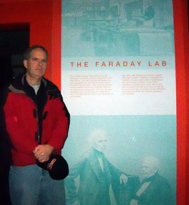 In London, Billy and I visited Faraday’s workshop in the Royal Institution. Poor Michael set up shop in the servants’ quarters in the basement. The shop is still down there (behind glass and well-preserved now). The painting above depicts Faraday at work in his shack.