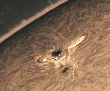I got up early this morning, and so did 30 meters. Take a look at the WSPR signal reports that greeted me (below). My 20 mW DSB signal was making the trip to Norway and the UK through most of the night. And at 0256 W1BW picked it up. A visit to the excellent spaceweather.com website reveals that this is probably the work of sunspot 1057. Rogerio Marcon took this picture of that sunspot on March 24 from his backyard observatory in Brazil. (This and a recent thread started by Chris Trask on QRP-L make me think that I NEED a solar telescope.)