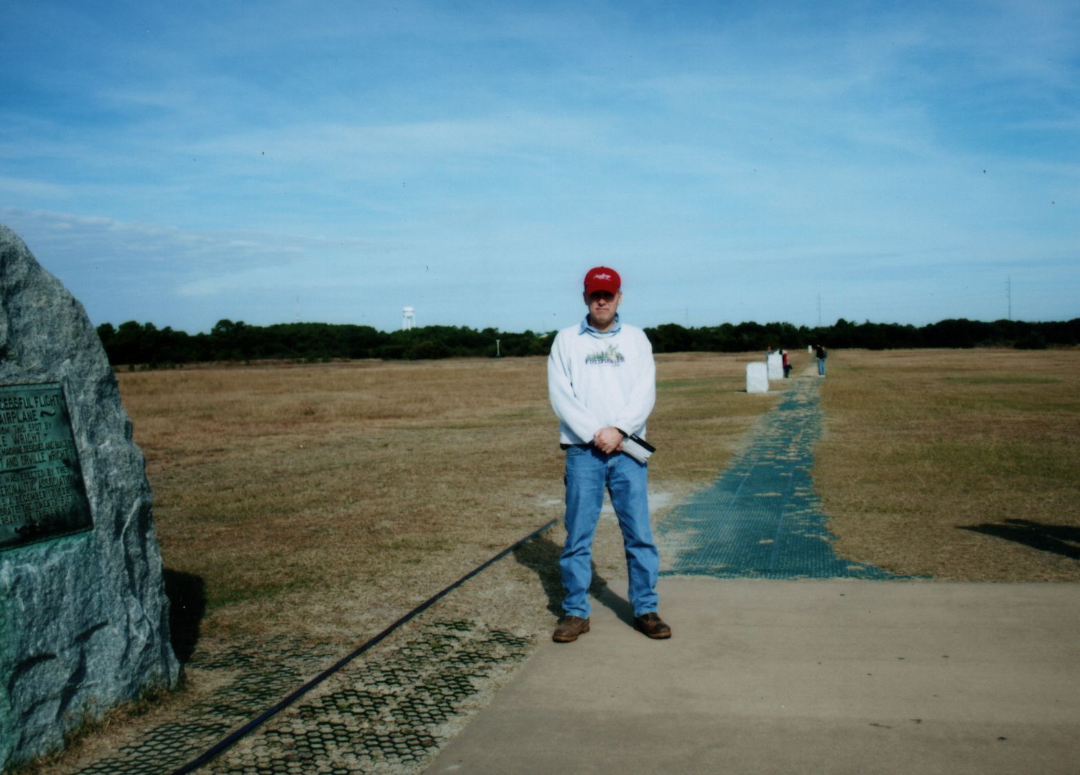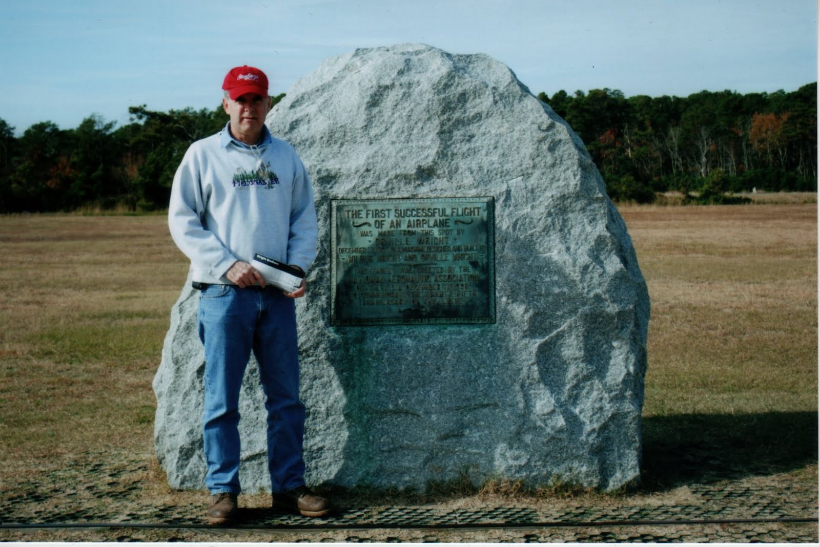 Kitty Hawk N.C., Thanksgiving 2010. Wright Brother’s test site. The big rock marks the take-off point. You can see a reproduction of the monorail they used in lieu of landing gear. the white markers behind me show the distances covered on those first four flights. Off in the distance you can see the final, longest flight of that day: 852 feet. 59 seconds aloft.