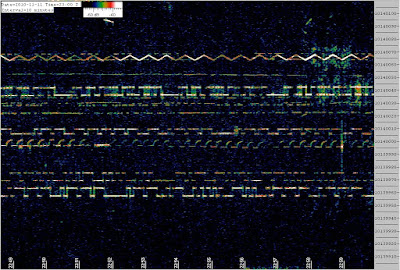 My signal is the “shark-fin” pattern just a little below the middle of the screen. That’s 20 mw to a 50 foot piece of AC line cord about 12 feet off the ground. And it is making the trip from Northern Virginia to Pensacola Florida very consistently. Thanks Bill!