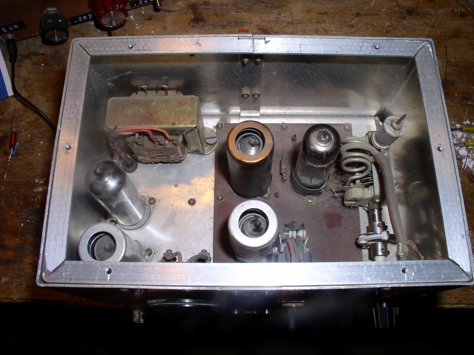 I think the workmanship is beautiful. The technique of putting the tube sockets on a copper clad board is interesting. I wonder why he did that — obviously he wasn’t afraid of metal work. Look at that cable harness work! FB! It’s too bad the builder didn’t mark it with his call.