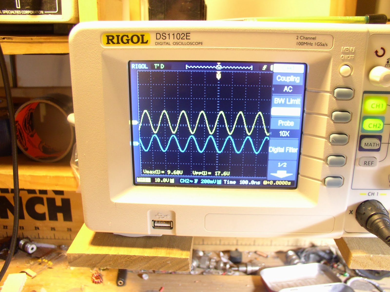 It’s not mine — I haven’t started yet. But Robert sent us this picture and progress report on his BITX-20 project. (Nice Tek scope in the background. Is that a 465?)