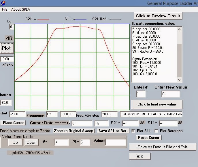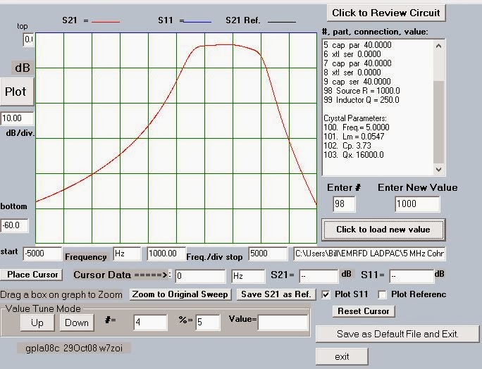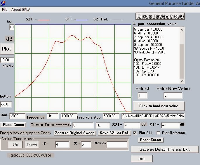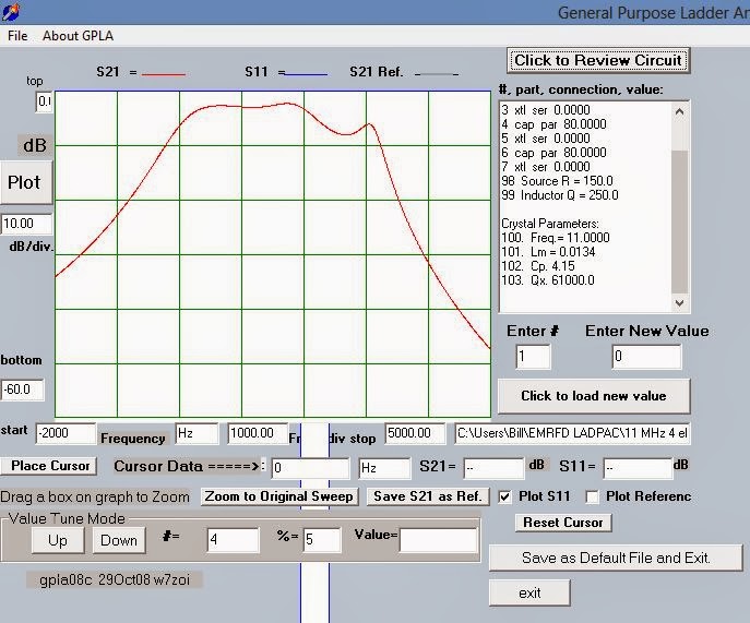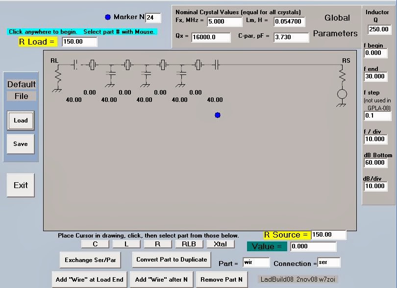 Having had great success in straightening out the 11 MHz filter in my BITX 2040 (scroll down for details), today I decided to see what I could do with the filter in my 17 meter BITX (four 5 MHz crystals in Cohn MIN LOSS configuration, with 40 pf caps all around). The key to my success in all this has been the filter programs that came with EMRFD. After characterizing my crystals with the G3UUR method, I plugged the values into LADBUILD 8, then took a look at the expected results. As you can see from the image above the predictions were not pretty. Yuck. Lots of ripple and lots of insertion loss.