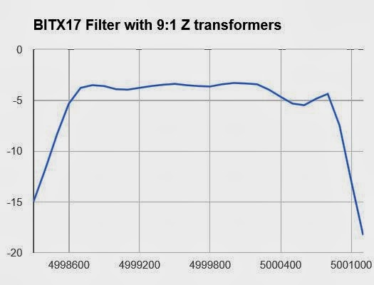 So I went and built two broadband toroidal transformers. 4 turns primary with 12 turns secondary (1:9 Z). I’m assuming that the BITX has around 150 ohms at either end of the filter. That would put about 1350 ohms at the ends of the filter.