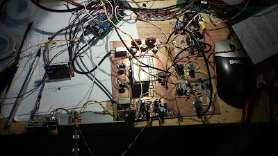 — Sometime around 2000 I bought another one. This one had been built on a FAR Circuits board by Dale Parfitt, W4OP. Dale had used 5 MHz rocks for the filter and had used a varactor tuned circuit for the LO (with a DC-DC converter to increase the range). I put it aside. It sat on shelves in several countries for a number of years. (I even have a THIRD one, a partially stuffed board that Michael Hopkins (the guy who wrote those great stories about Frank Jones coming back to life to retake the 5 meter band)).