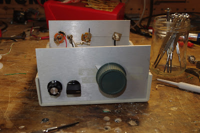 Much to the consternation of Pete “Digi” Juliano, I have been working on analog LC VFOs for simple superhet receivers. As described in earlier posts, I recently converted an old Barebones CW superhet to 40 meter SSB. At first, the VFO (2 -2.3 MHz) was not stable enough — it would slowly drift in frequency. (“We have a solution for that,” chuckled Pete.) My first effort at stabilization involved replacing the toroidal coil. The material in the core is sensitive to temperature changes and this can lead to instability. I found my traditional cardboard tube from a coat hanger, and made a coil of the needed inductance (you can see it in the pictures). This yielded some improvement in stability, but it was still drifting.