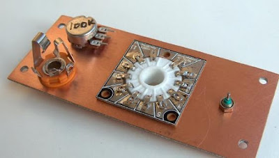 This is another example of “right side up” thermatron mounting on a prototype test board for crystal filters. I mounted a small “plug board” (not sure what you call these things) in the center to allow me to easily swap filter components. Notice the acorn thermatron soldered direct to the pad. The board works great, the filter design sucked. I gave up. Maybe too much distributed C.