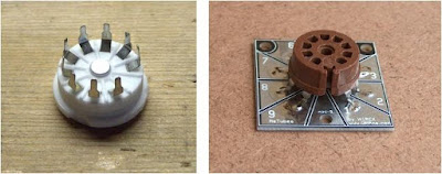I pre-mount a dozen or so of the 7-pin and 9-pin sockets on MeTube pads so I have them ready to go when prototyping. The “crude” example below shows and 7 and 9-pin socket on one of my prototypes. I think this was a microphone amp for my AM transmitter. Pardon the mess.