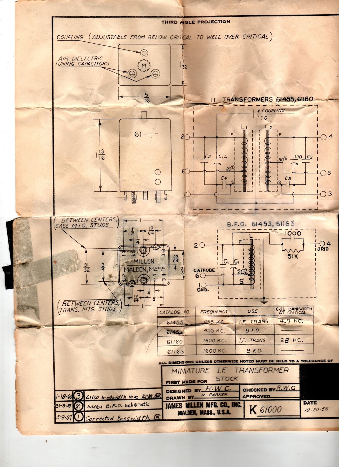 I found this in my junk box. I’ve put it in my old Mate for the Mighty Midget receiver, in the place of the Toyo CM455 crystal-mechanical filter (which I found to have excessive insertion loss). I think its very cool how they squeezed two variable caps into that little can. Designed in 1956. Works great. Note the promised passband: 4.7 kc at 6 db down. Not bad for an LC device.