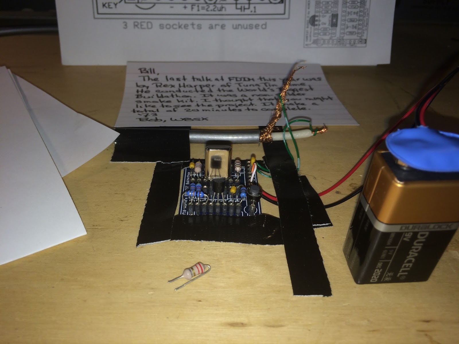 As I did with my HROish receiver, I put the coil and the caps in one box, with the MPF-102 and associated parts in an attached Altoids tin. Everything was glued and bolted down very solidly.