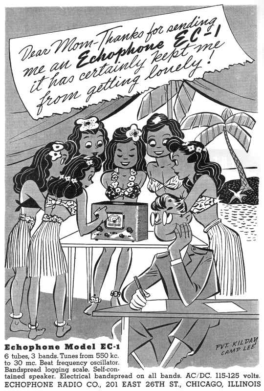 This morning I came across a character that I hadn’t been aware of: Private (later Corporal) Hogarth. He was the theme of a series of ads run by the Hallicrafters Company during World War II. They were trying to sell their EC-1 broadcast receiver (essentially an All American Five). Their advertising theme was, essentially, “chicks dig it.”