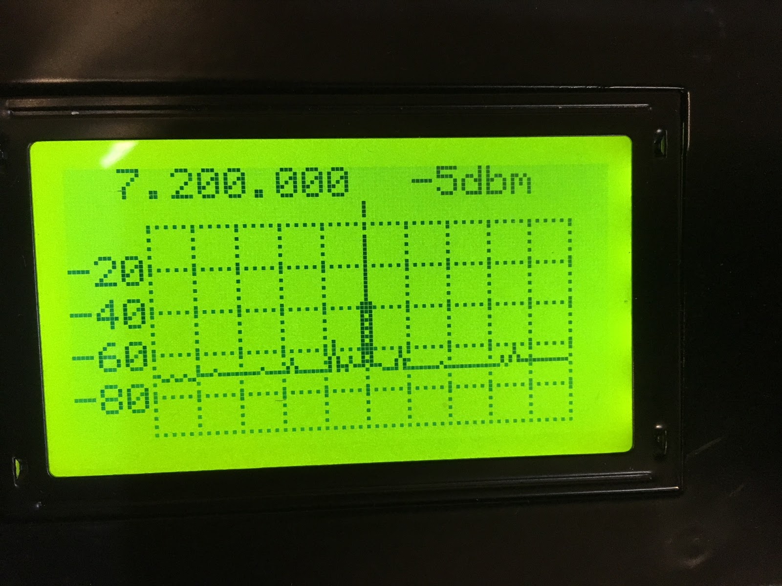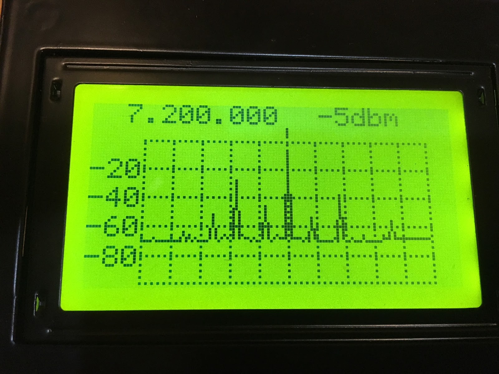 At first, I didn’t want to believe it. I was in denial. I wanted to shoot the messenger (in this case, the Antuino). How could my beloved HB 40 meter DIGITIA transciever have an output that was so…. so DIRTY! Everyone tells me it sounds great. But the little Antuino screen told a different story. Strong spurs up at 9 MHz and down at around 5.4. And lots of places in between. (In these display images, the center frequency is 7.2 MHz and each division to the left or right is 1 MHz.)