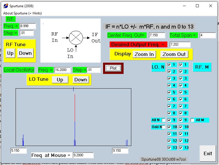 Through this, I gained a better appreciation of the importance of the bandpass filter in an SSB transceiver. I’d always thought of it as something that allowed the other mixing product to be eliminated while passing the one you want. But I came to realize that it does a lot more than that — it also helps get rid of spurs. If it is designed right. Mine was not. I had plucked it out of an old QST article and had not paid much attention to it. All it needed to do was knock down the unwanted mixing product, right? And in my transceiver (9 MHz IF, VFO running 16.0 – 16.3) MHz that unwanted product would be way up at 25 MHz. It wouldn’t take a lot of selectivity to knock that down. But I’d forgotten about the closer-in spurs. Antuino reminded me of them. And SPURTUNE explained where they came from.