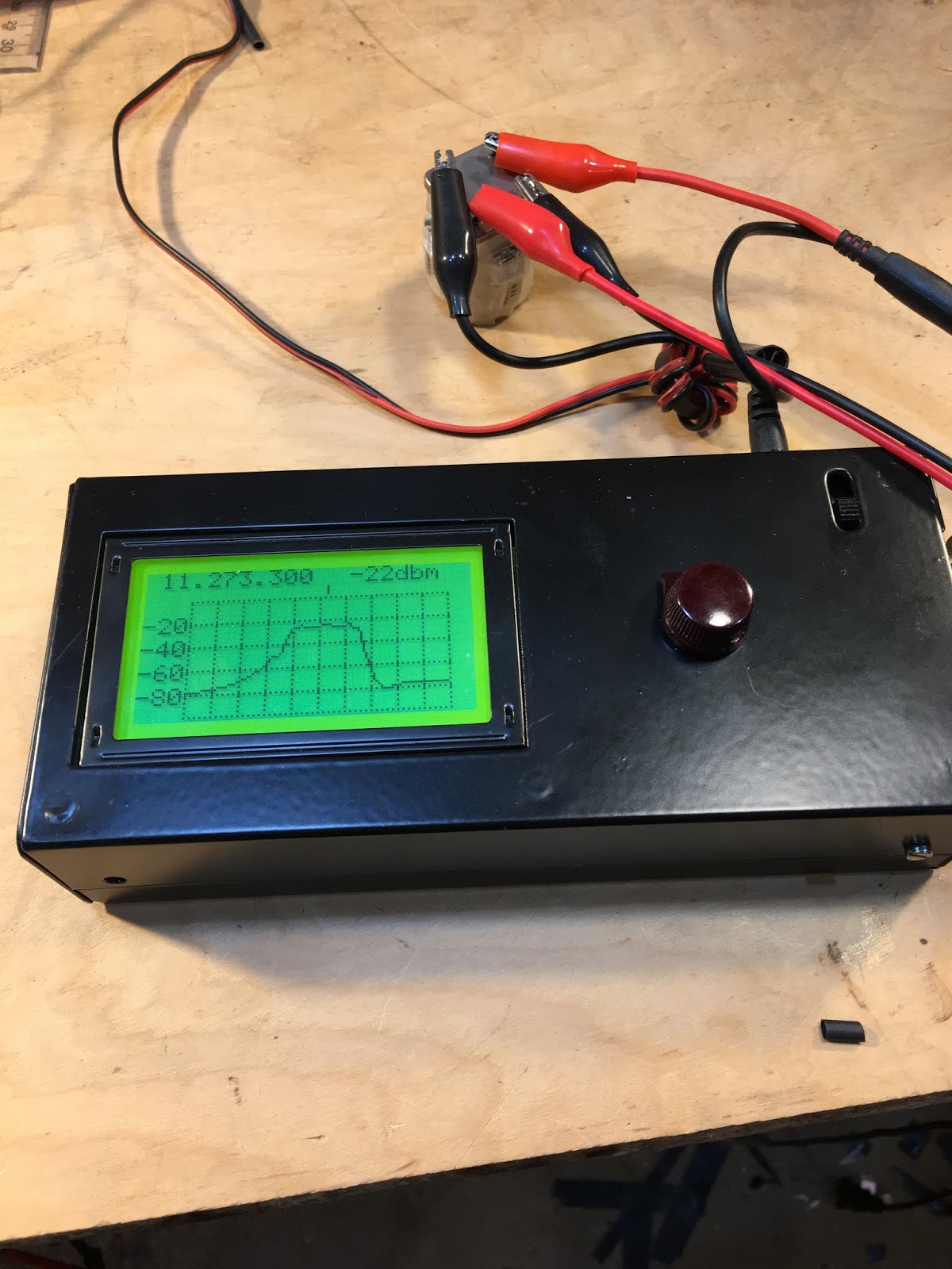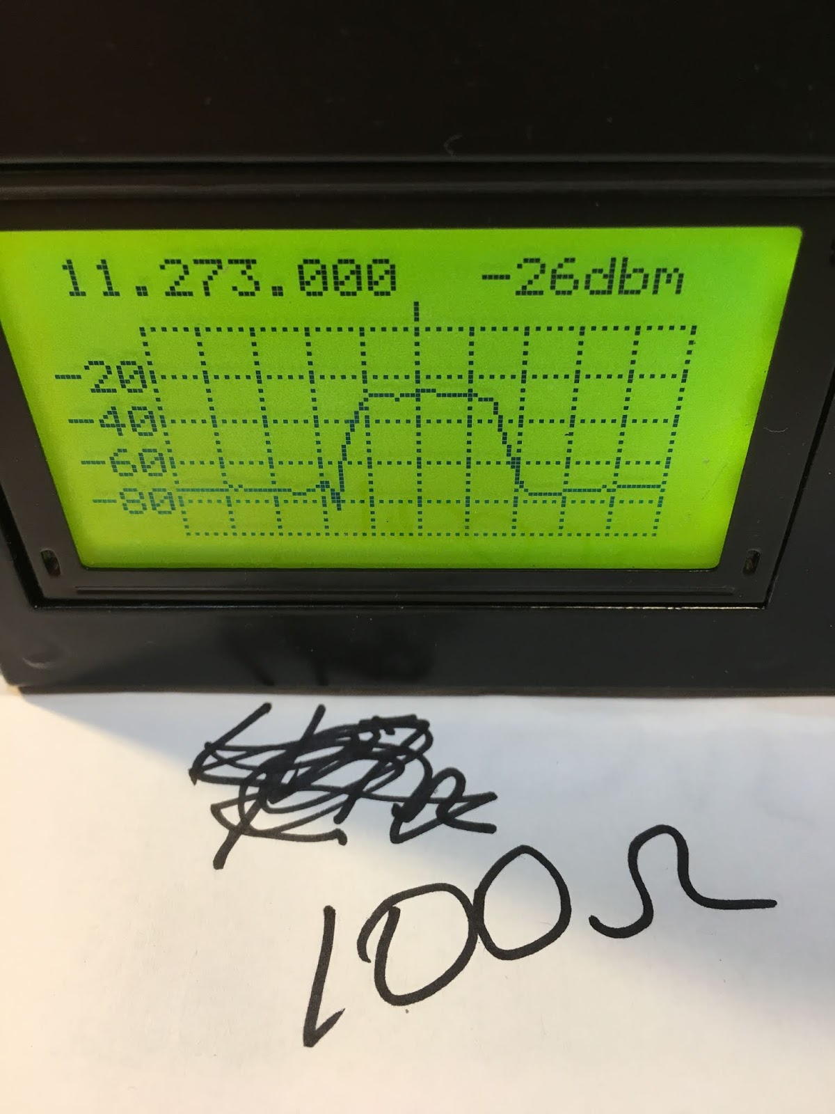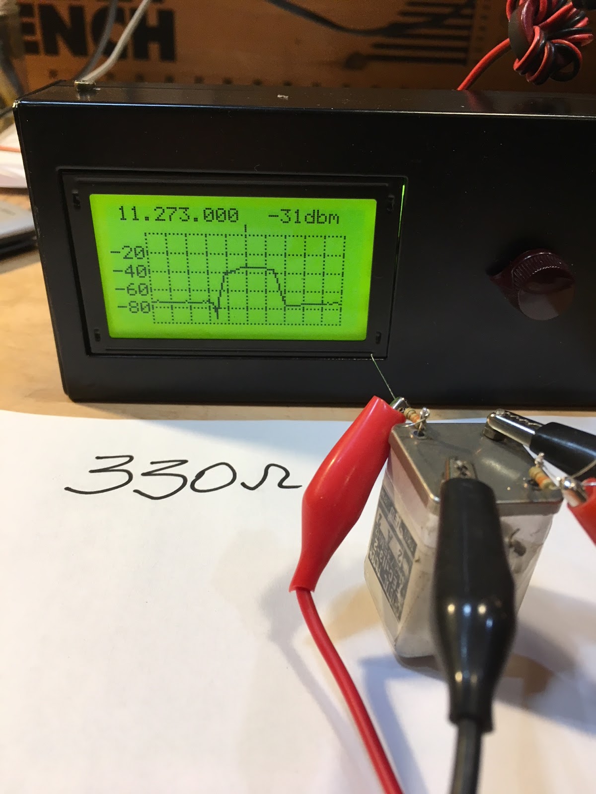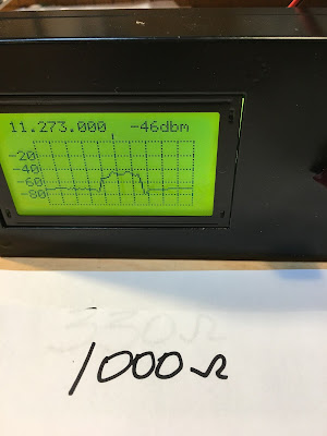 And it is very useful in evaluating the passbands of filters. I had an old 11.273 MHz filter from an old CB radio in my junk box. I have no specs on this device — I didn’t know what impedances it was designed for. So it was time for some Antuino technical detective work.