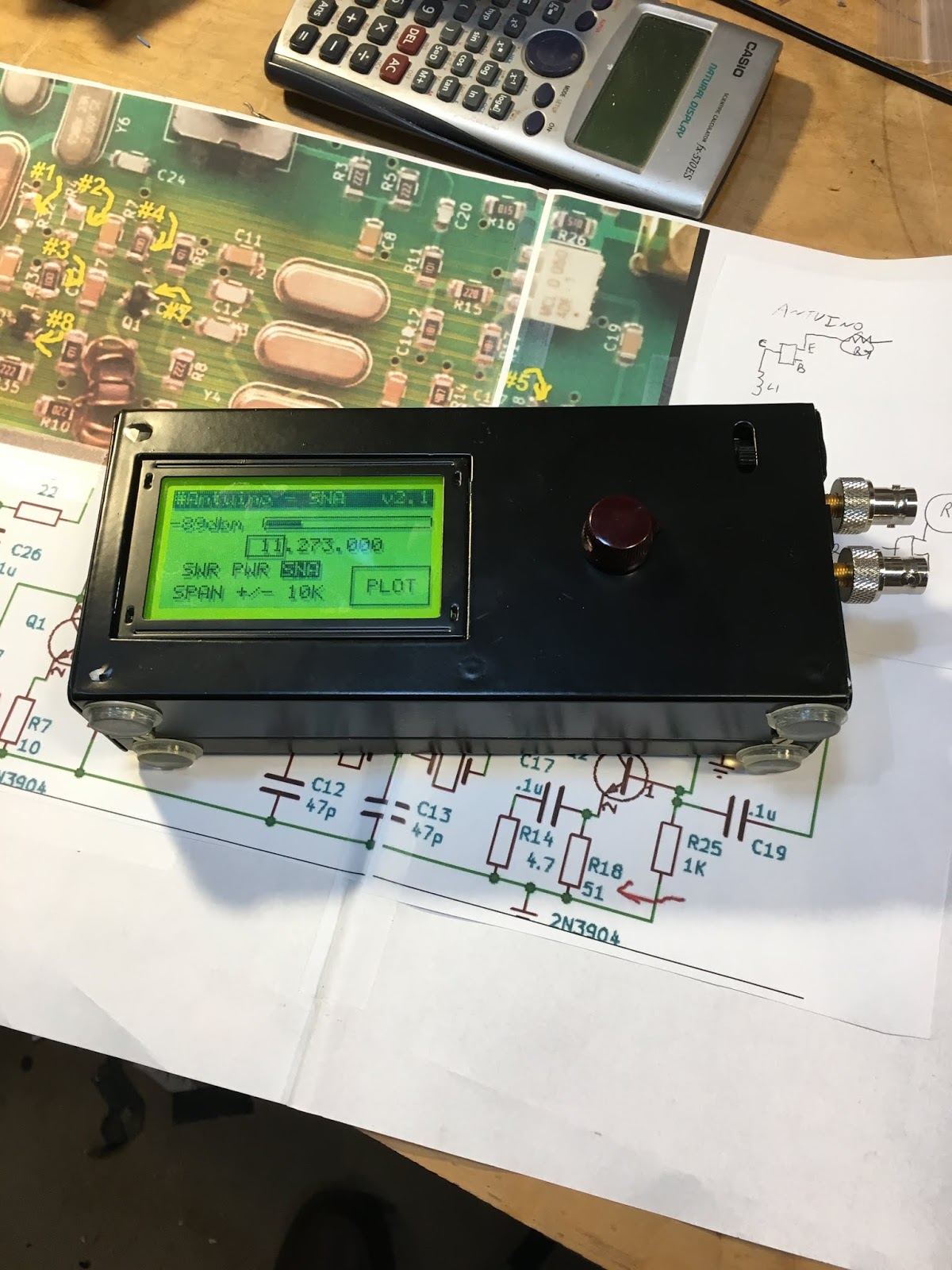 Farhan had given me one of the early Dayton Hamvention models of the Antuino SWR/PWR/SNA RF test lab. He later identified the need for a few mods to improve performance on that early model. So I brushed up on my surface mount soldering, got the needed (tiny!) parts and made the mods. I also put the battery pack inside the box and put some feet on the Antuino cabinet (it just seemed like the right thing to do).