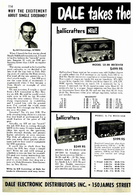 Dale claims that with SSB you could have TWO roundtable QSOs on the same frequency, with one group on USB and the other on LSB. I think this assumes really great opposite sideband rejection in the transmitters, and excellent selectivity in the receivers. That might have been a bit of a stretch. But the assumption here was that hams could use USB or LSB — no rigid adherence to the USB/LSB convention. And the ad seems to focus on the 75 meter band which was seen as the most important phone band at that time.