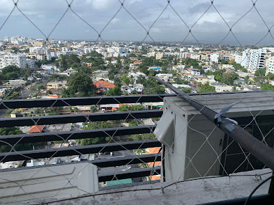 We are up on the 12th floor of a building in Santo Domingo. I brought my uBITX and managed to check in as baggage a 16-foot crappie fishing pole. I figured I needed to get the 1/2 wave antenna away from the building — last time I was here I was unable to make any contacts from this location with the antenna stretched along the balcony. Last time I was QRP with an SST transceiver.