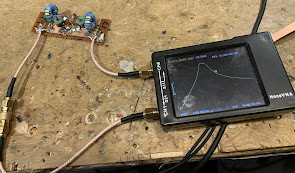 I was especially worried about the output from my 17-12 rig. The IF is at 21.4 MHz. The VFO runs around 3.5 MHz. So if you add the IF and the carrier oscillator signal you get to 12 meters. If you subtract them you get to 17 meters. But you need some good bandpass filtering to sufficiently knock down the unwanted output from the mixer. And the BP filter should be sufficiently narrow to take out any remnants of the carrier oscillator signal. I had taken the easy way out and had used simple dual-tuned-circuit (DTC) filters. I started to wonder if these simple BP filters would be enough to knock down the 12 meter signal while on 17 and the 17 meter signal while on 12. I pulled out my NanoVNA to look at the passbands: