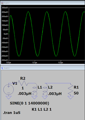 I looked at two ordinary wires. I gave them each a value of .003 uH. Very low. Then I joined them together in a transformer. I put a 1 volt signal into the primary and looked (in LTSpice) at how much of a signal appeared in the secondary. First, the result on 14 MHz. About 250 mV appears on the secondary.