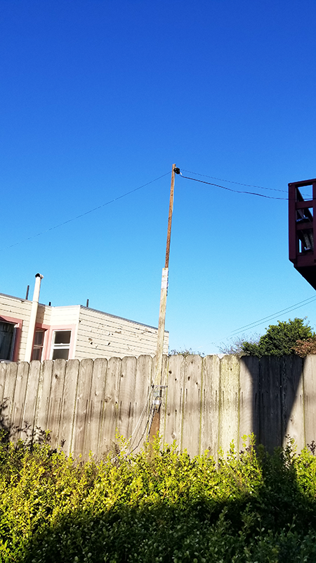 With space at a premium in San Francisco, the antenna that I have settled for is an inverted vee installed in my backyard (and it just barely fits). I made the mast by lashing together wooden planks. For this city dweller, it works FB: