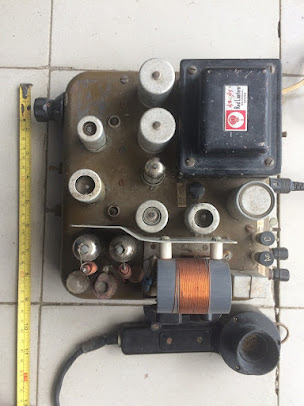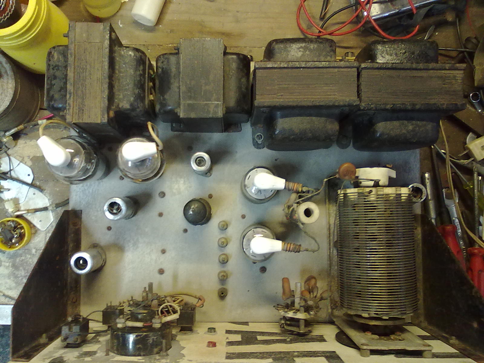 It used combined Soviet and American tubes in the RF sections: Soviet 6P9 and (2) 6146. The modulator used Soviet 12AX7, 12AUT and (2) 6P7. The 6P9 works as a crystal oscillator, and in case of using an external VFO it works as an amplifier and doubler or tripler to obtain outputs in the 160,80,40,20,15 and 10 Meter bands.