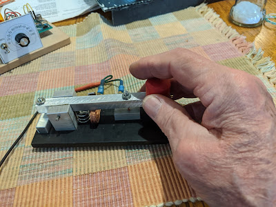 The first photo shows the transmitter connected to a Transmit/Receive Switch mounted in an Altoids box. In the Transmit position the antenna is disconnected from my 1979 Heathkit HR-1680 receiver, which then coincidentally supplies a sidetone at an ideal volume level. That little black pushbutton which can be seen in the second photo serves as my key, and works just fine for a five-minute daily QNI on the Sunrise Net.