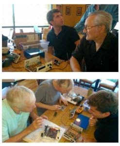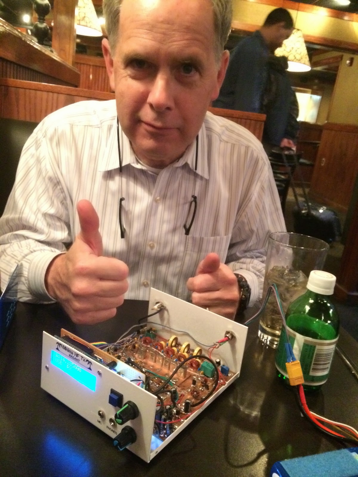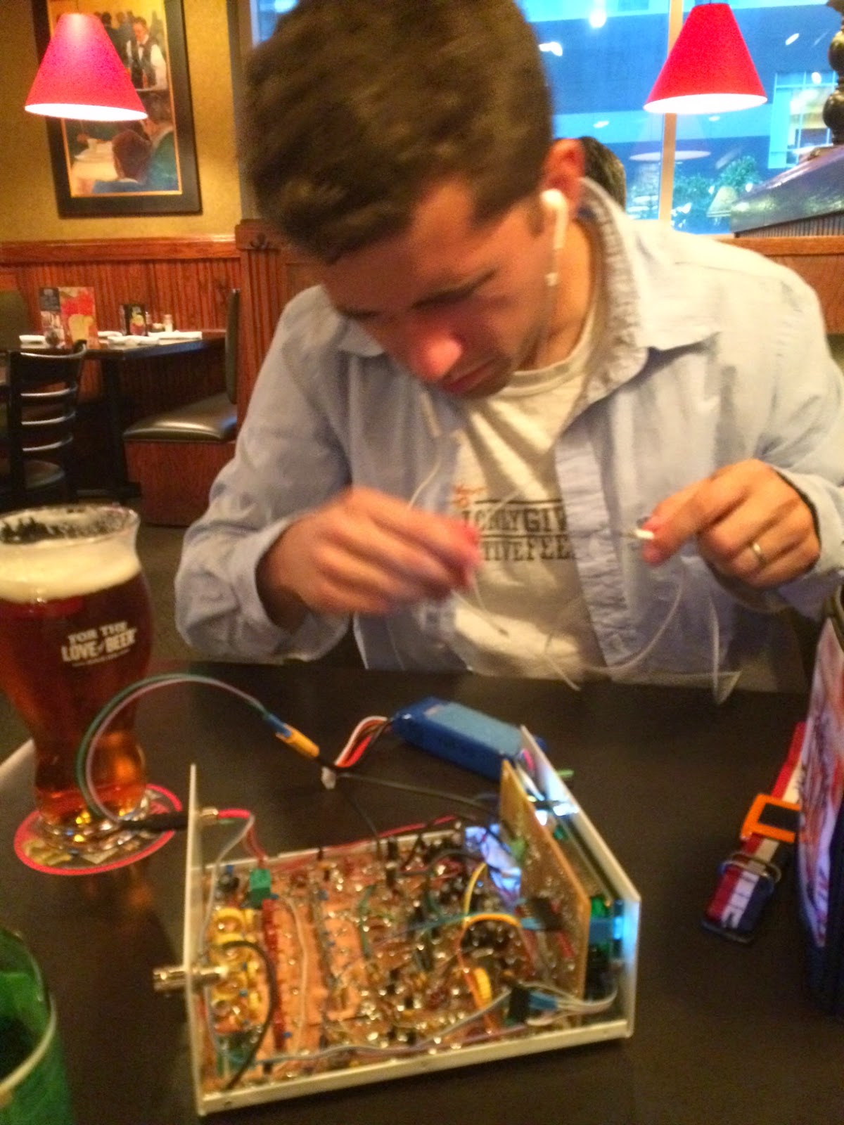 Showing true homebrew dedication, Thomas was unhappy with the level of audio output when we turned it on. He started to trouble-shoot right there in the Ruby Tuesday bar!