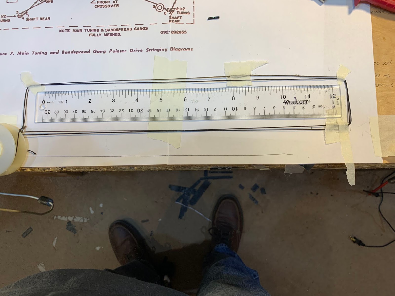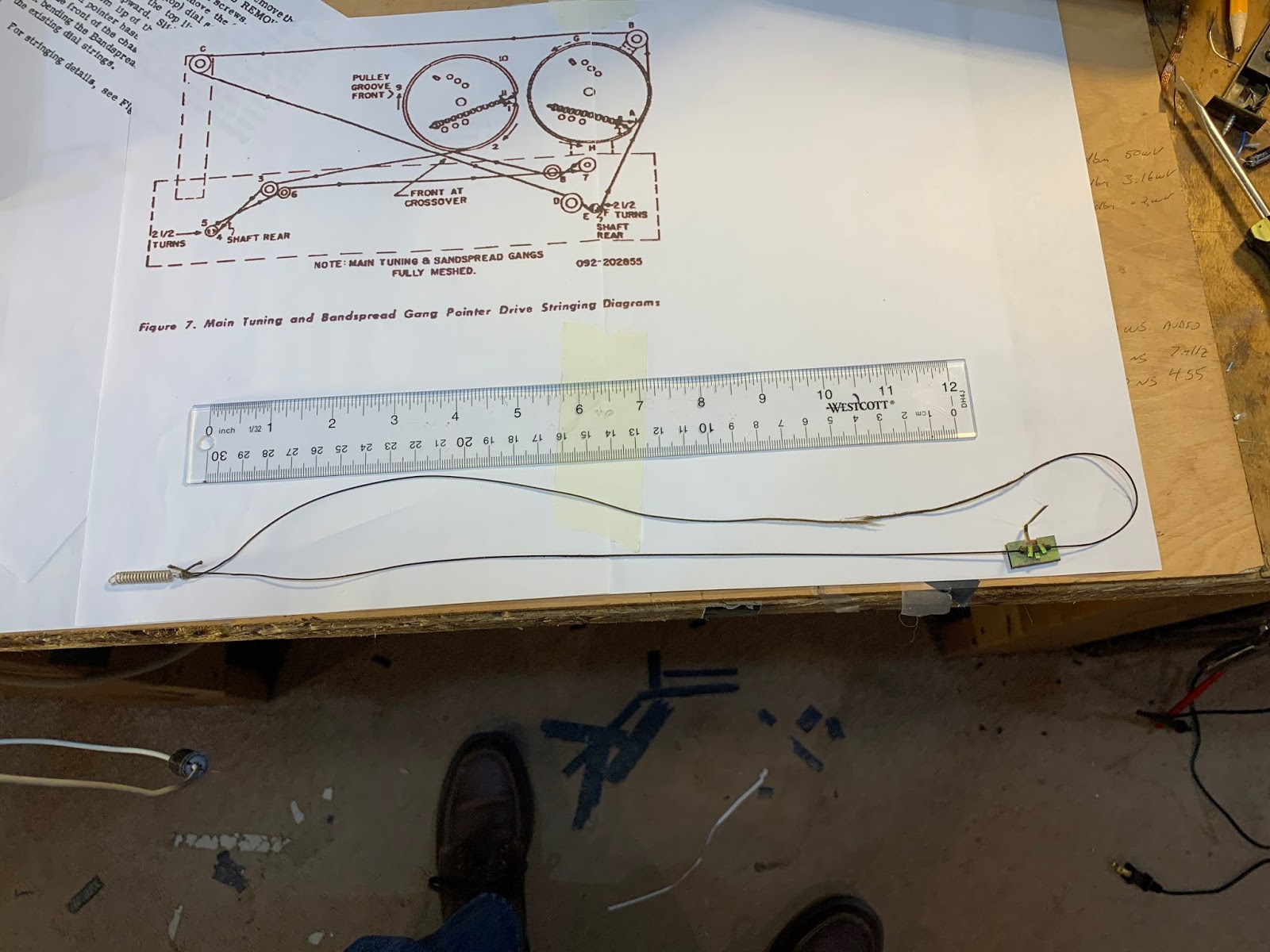 ALIGNMENT OF THE JUNKER Armed with my newfound knowledge of how to align an S-38E, I applied this skill to the junker and was able to get it aligned without difficulty. RE-STRINGING OF DIAL CORDS On both of these S-38-Es there were dial string problems. Interestingly, both problems were with the BANDSPREAD dial cord, NOT with the MAIN TUNING dial strings. I see this as evidence that these receivers were used by ham radio operators. You don’t really need the bandspread to tune AM shortwave station, or AM broadcast band stations. But novice ham radio ops would be frantically tuning that bandspread control up and down, wearing those dial springs out. The Bandspread dial string on my Winterfest S-38E broke while I was turning it — I replaced it but it is not really smooth, so I may try again. The Bandspread dial on the junker broke also.