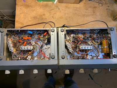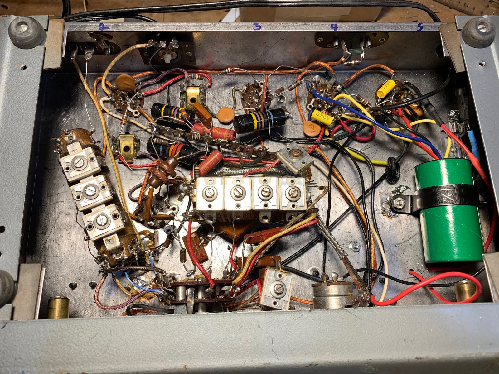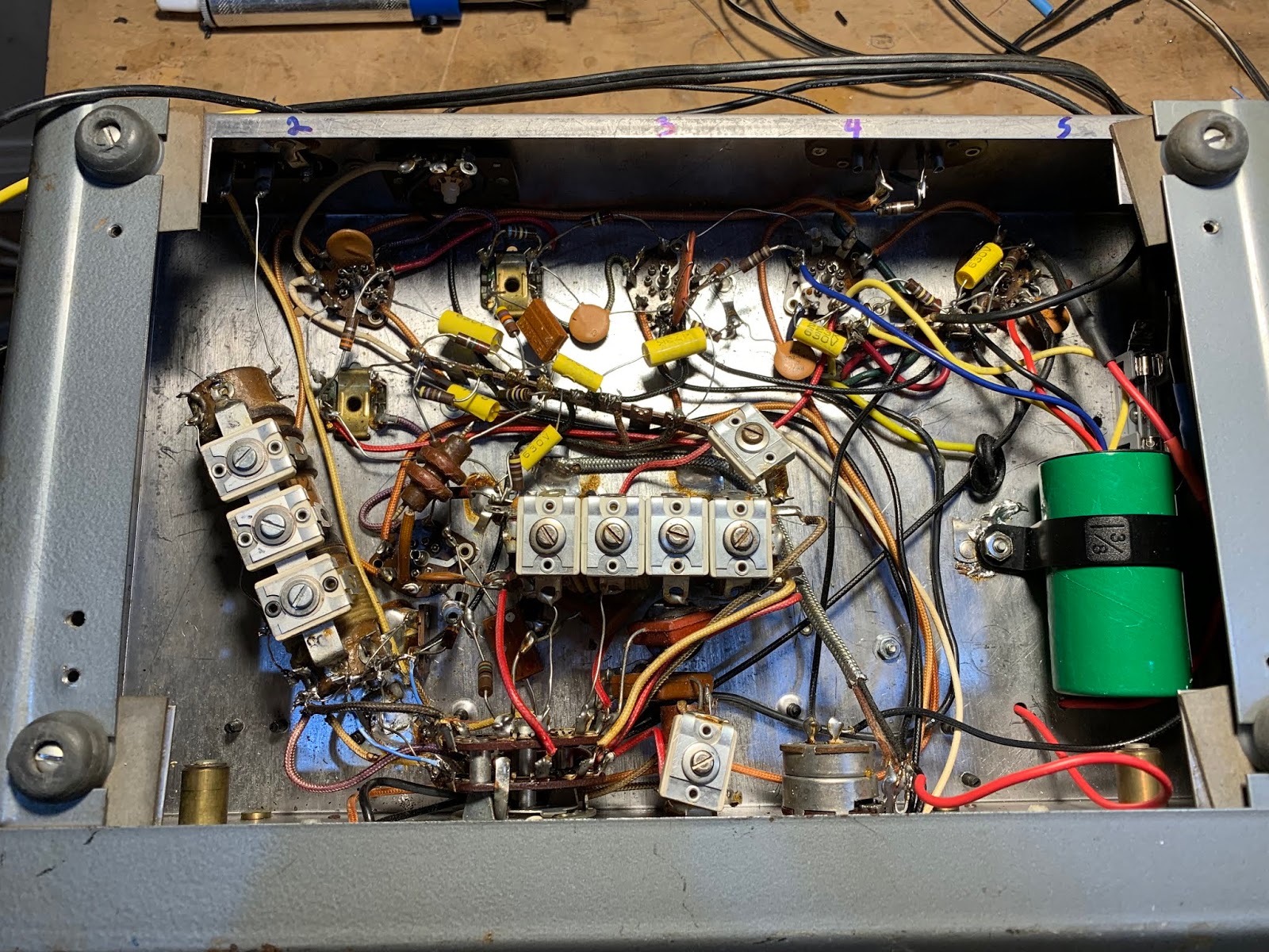 Recapping in process. Hayseed electrolytic in green can.. Old tubular caps being replaced by new yellow caps.