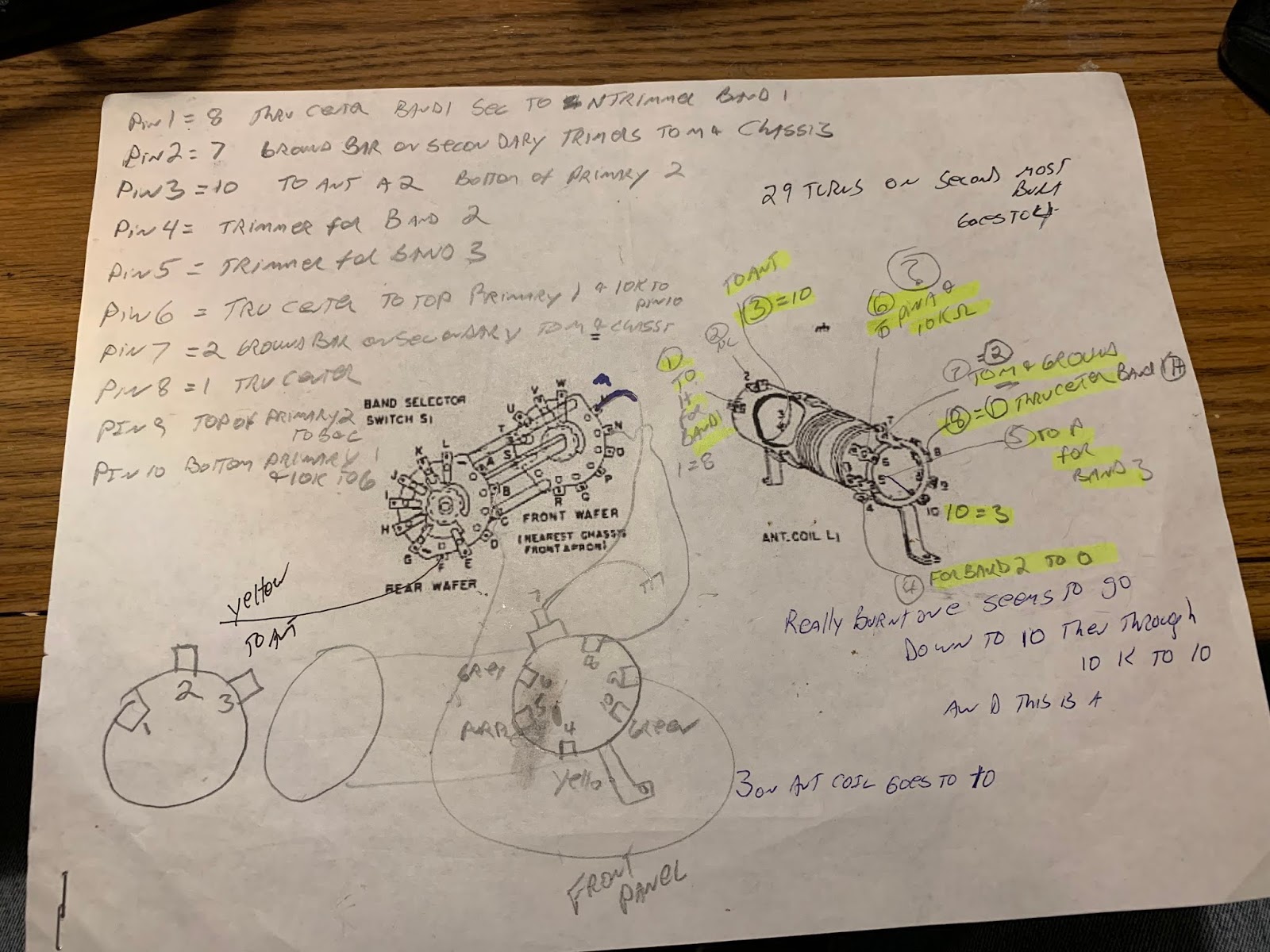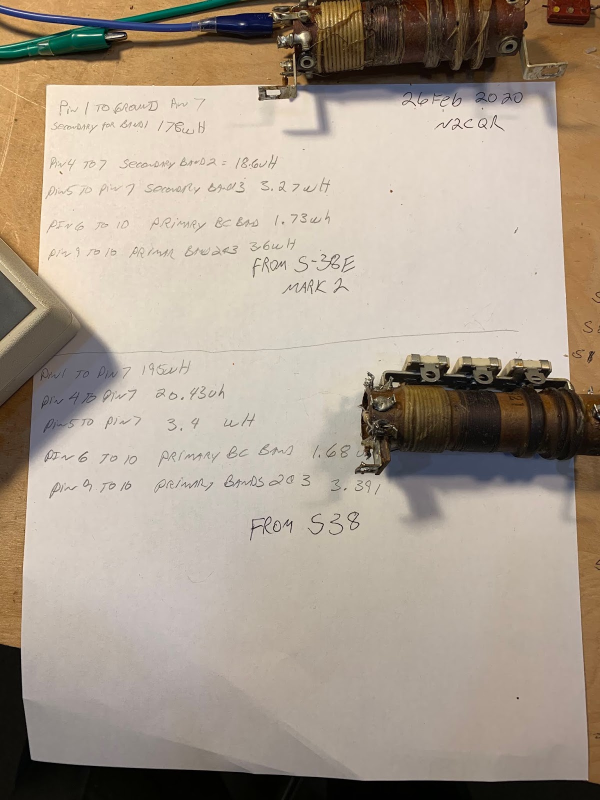 After the smoke release, I tried to re-wind the burned out portions of the antenna coil on the Winterfest S-38E, but I got tired of the project, cursed all S-38s, and sent mine to the basement/crawl space. I would have given it away, but I was afraid that the recipient would electrocute himself. So it sat in the basement for a couple of years. Recently I got interested in shortwave listening again, so I pulled out the S-38E. On e-bay, I found and bought an S-38 antenna coil. I put it in my S-38E, hoping that it would bring the receiver back to life. But I had a lot of trouble with the front end alignment. I theorized that the coil I had bought was from the original model of the S-38, and perhaps the S-38E coil had different inductances. So I went back to e-bay. There I found a junker S-38E being sold by Mark W1MEM. It had been owned by KA1WFY. At the suggestion of Scott W1NB on the AntiqueRadio forum, before installing the coil from the junker, I measured the inductances of the S-38E coil and the previously obtained S38 coil. I was surprised to find that the values were almost identical. That meant that my theory about coil inductance differences was incorrect. But I took the S-38E coil from the junker and put it in my S-38E. I took note of the fact that the junker did not in fact look like junk, but there it was, sitting on the floor of the workshop, having had its antenna coil extracted. And I had in hand the old S-38 coil that I knew from testing was very close in value to the S-38E coil.