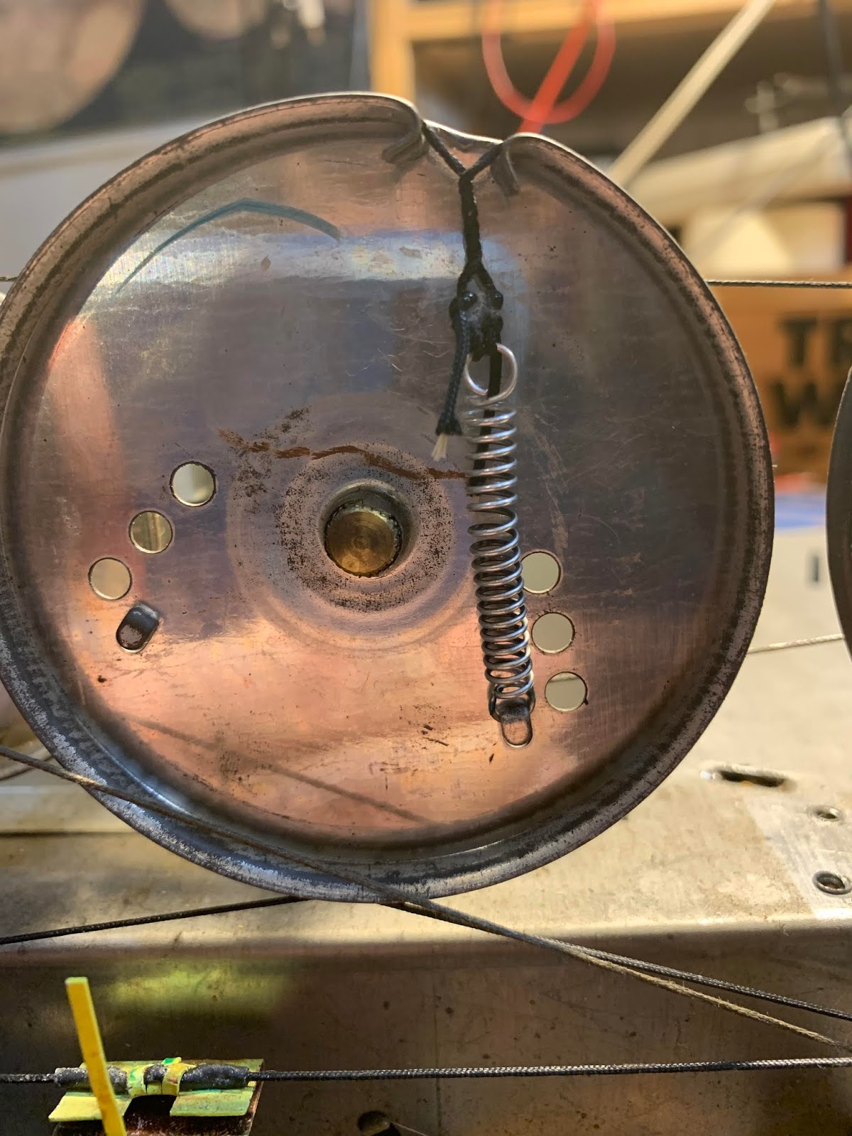 My re-stringing skills were better the second time around. Tips: use a small file to “roughen up” the spindle on the tuning knob (just the center of the spindle, so it will grab the cord better). Before installing, rub the new dial cord with an isopropyl alcohol pad, then run the string (still a a bit wet) several times over a piece of violin rosin. This seemed to prep the dial cord well. Sometimes you need a bit more tension on the string to get the tuning spindle to grip properly. Unlike the Drake 2-B, the S-38E does not have several hooks on which to attach the spring. Not wanting to have to start all over just to add a bit more tension on the string, I came up with an easier solution: Just put a few twists in the string near the spring by twisting the spring (with strings attached) around a few times. Like this: