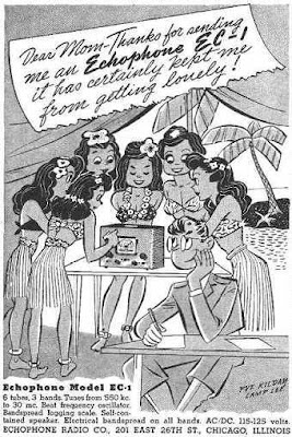 But as I’ve gotten to know the receiver better, I have come to like it. It is very simple. There is a certain minimalist thing that explains the attraction; it is a challenge to make the most of this very low-budget 1950’s receiver. It uses tubes, but the voltage is not really in the very lethal range. It covers a wide range of frequencies. Its frequency stability is fairly good. And it sounds great on AM (scroll to the bottom to listen). It seems to be technologically related to the Echophone EC-1 — we have been posting about the WWII advertisements featuring Hogarth and his (unbelievable) efforts to attract women with this receiver.