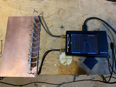 I was especially worried about the output from my 17-12 rig. The IF is at 21.4 MHz. The VFO runs around 3.5 MHz. So if you add the IF and the carrier oscillator signal you get to 12 meters. If you subtract them you get to 17 meters. But you need some good bandpass filtering to sufficiently knock down the unwanted output from the mixer. And the BP filter should be sufficiently narrow to take out any remnants of the carrier oscillator signal. I had taken the easy way out and had used simple dual-tuned-circuit (DTC) filters. I started to wonder if these simple BP filters would be enough to knock down the 12 meter signal while on 17 and the 17 meter signal while on 12. I pulled out my NanoVNA to look at the passbands: