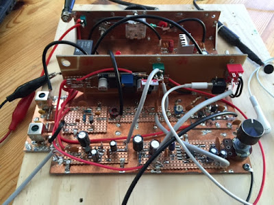 Here’s the transmitter and the schematic. FSK is from a simple two transistor multi-vibrator (G0UPL’s circuit — you can see it in the lower left):