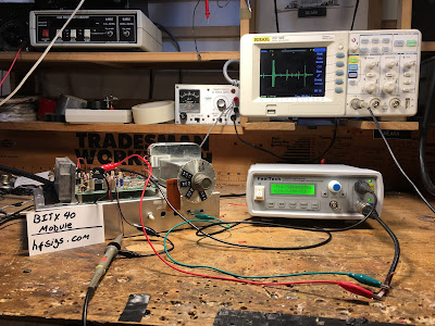 In this case I set up the Feeltech to sweep from 4.85 MHz to 4.75 MHz in one second. With the 12 MHz IF of the BITX40 module, this would result in a sweep from 7.150 to 7.250 MHz.